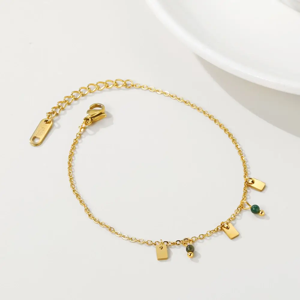 Deze gouden armband heeft steentjes in het groen. Doordat deze armband van stainless steel is met een plating van 14 karaat goud blijft het sieraad mooi.