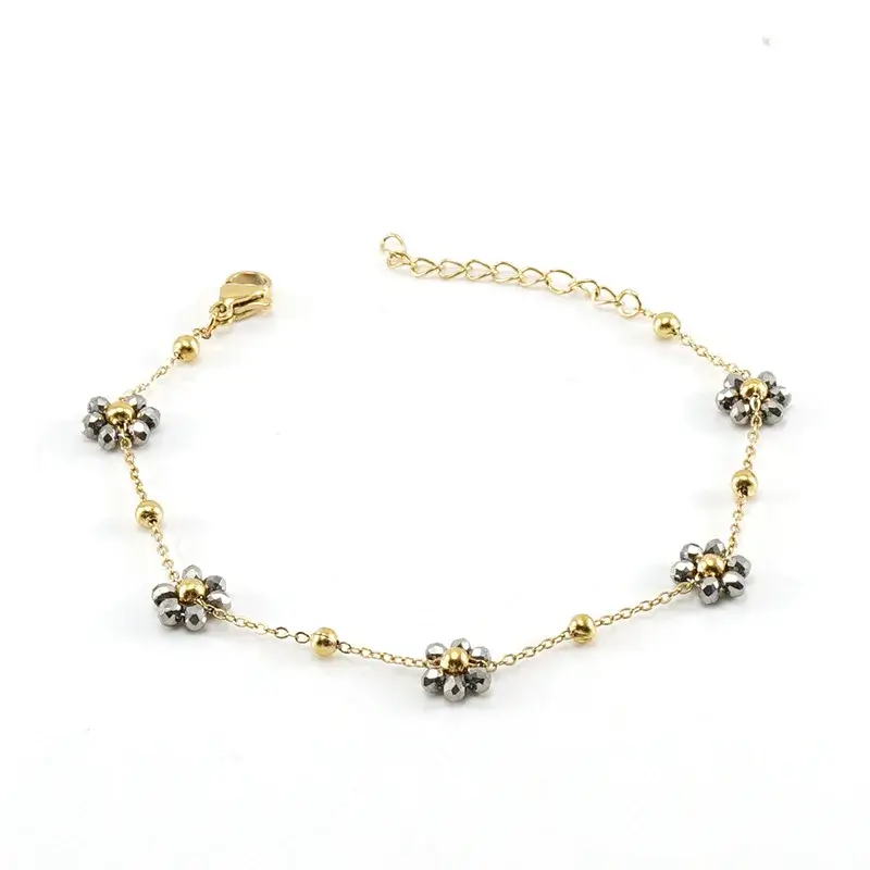 Super schattig deze armband met bloemetjes, toch te leuk voor aankomend seizoen! Deze prachtige armband is gemaakt van stainless steel en kralen, ook verkrijgbaar in het licht roze, lichtblauw, oranje en gekleurd.