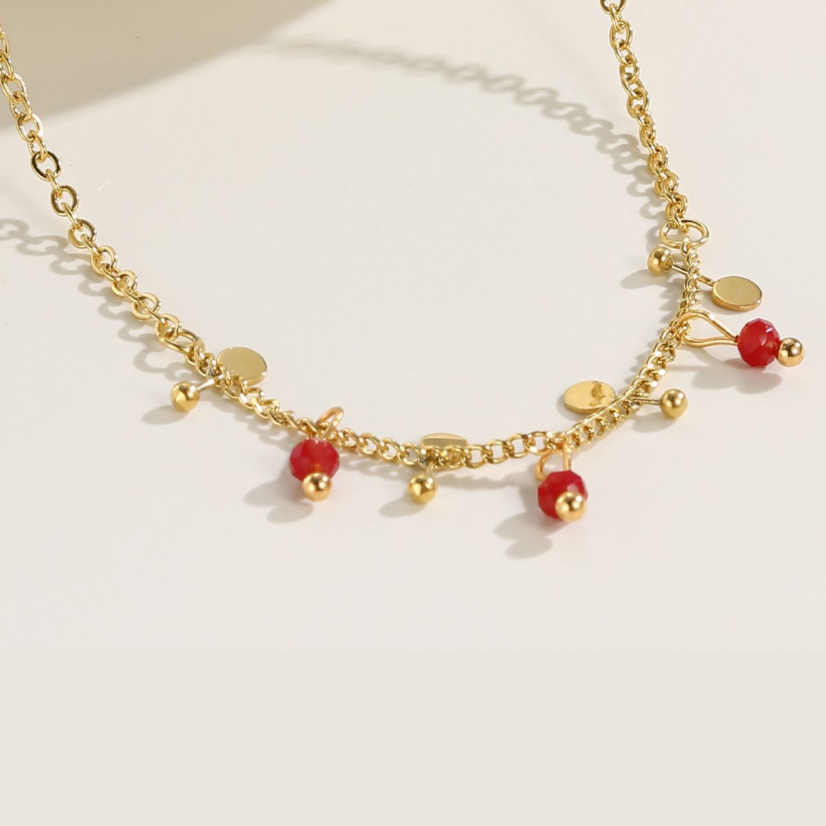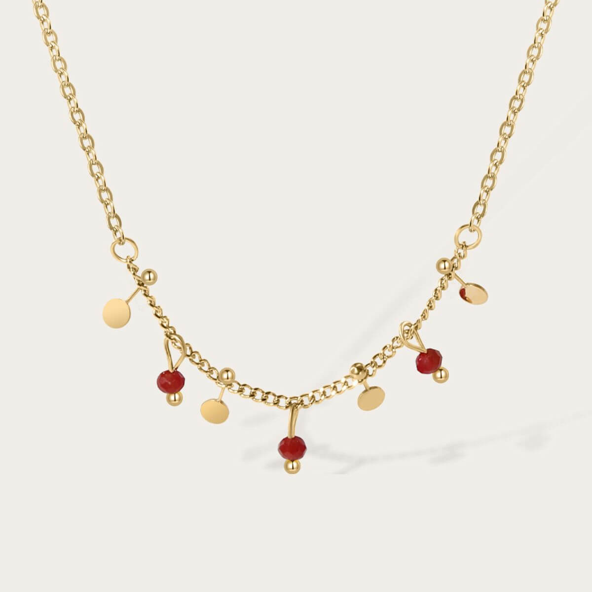 Hoe leuk is deze gouden ketting met rode steentjes. De ketting is gemaakt van stainless steel met een plating van 14 karaat goud en acrylic steentjes. Tip! Combineer deze ketting samen met de armband.